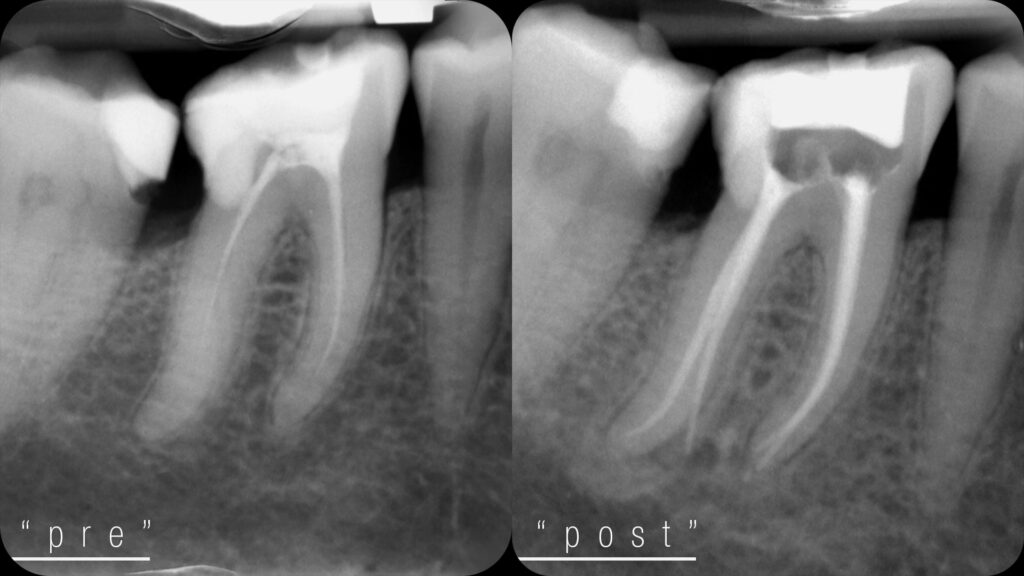 Con questo intervento rimuoviamo l’infezione all’interno del dente preservandone la struttura e mantenendolo in arcata, anche se privo della sua parte vitale.