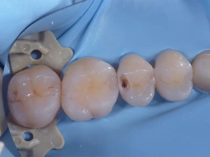 Dopo la diagnosi e la rimozione del tessuto danneggiato, il dente viene ricostruito con materiali compositi estetici di ultima generazione. Utilizziamo la diga di gomma per isolare il campo operatorio e garantire una sigillatura ottimale.
